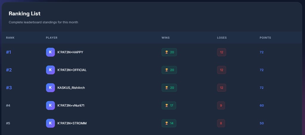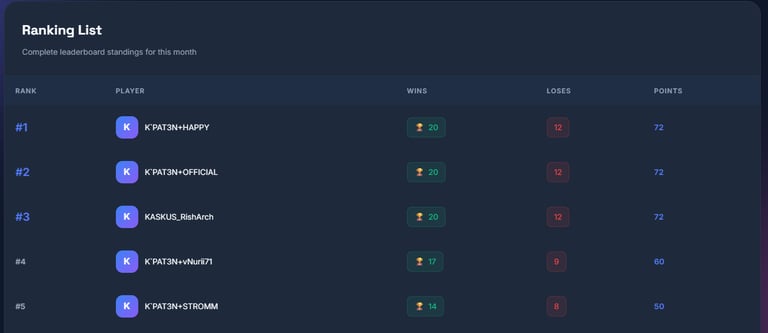 Tersedia leaderboard yang digunakan untuk menghitung point partisipasi anggota clan dalam hal clan war yang diupdate setiap bulan-nya untuk melihat ke-aktifan anggota clan.